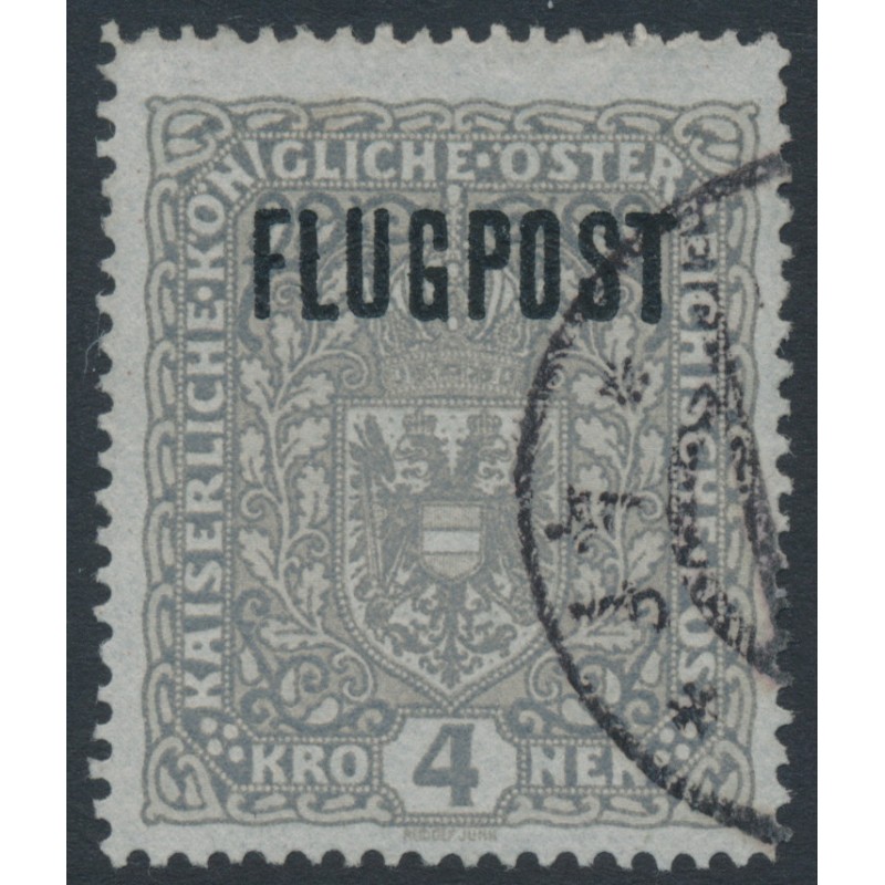 AUSTRIA / ÖSTERREICH 1918 4Kr grey Coat of Arms FLUGPOST overprint, perf. 12½:12½, picture size 25mm x 30mm, grey paper, used – no thins, tears or bends. Michel Cat. # 227xIA