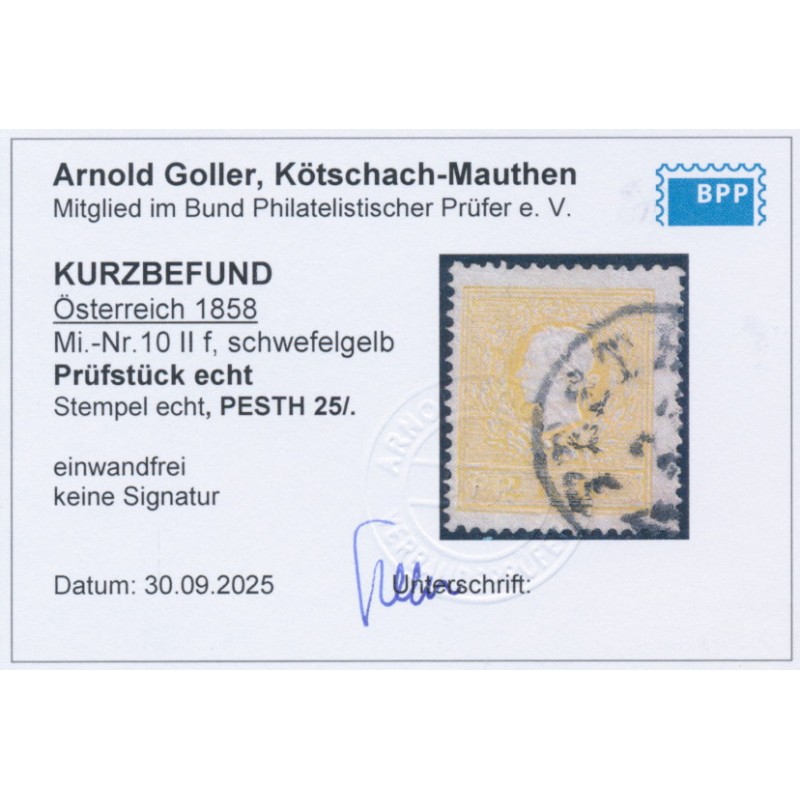 1858 2Kr sulphur yellow Emperor Franz Joseph, type II, used – has a PESTH cancel, no thins, tears or bends. Has a Goller BPP photo-certificate.