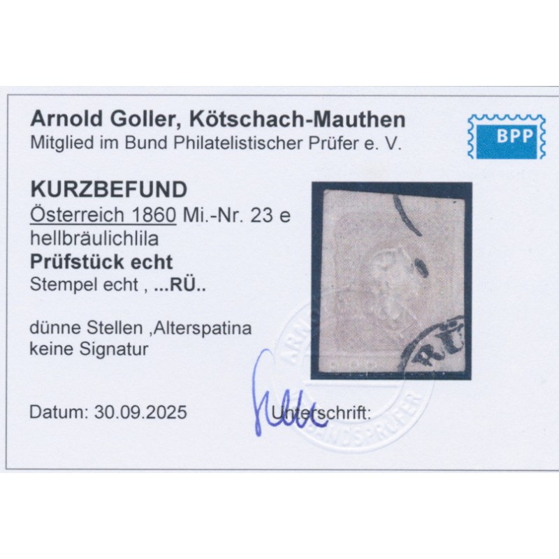 1861 1.05Kr pale brownish lilac Newspaper Stamp, used – is a bit grubby and has a couple of small thins. Has a Goller BPP photo-certificate.
