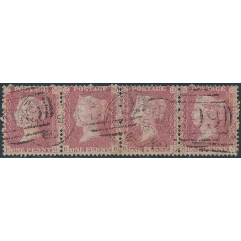 GREAT BRITAIN - 1857 1d red QV, plate 44, strip of 4 RG+RH+RI+RJ, used – SG # 40 (C10)