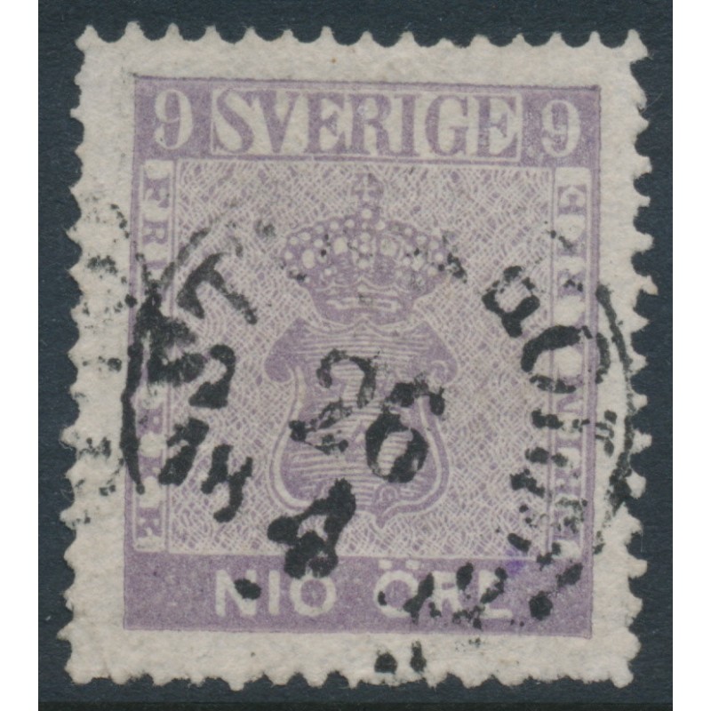 SWEDEN / SVERIGE 1858 9öre red-lilac Coat of Arms, used – STOCKHOLM 26 IV 1862 cancel, no thins, tears or bends. Facit Cat. # 8b Michel Cat. # 8a
