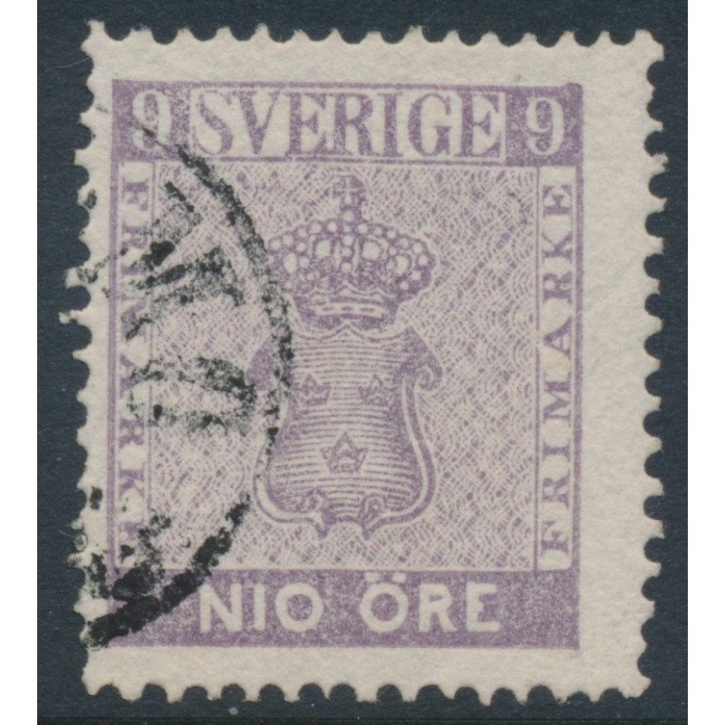 SWEDEN / SVERIGE 1858 9öre red-lilac Coat of Arms, used – no thins, tears or bends. Facit Cat. # 8b Michel Cat. # 8a