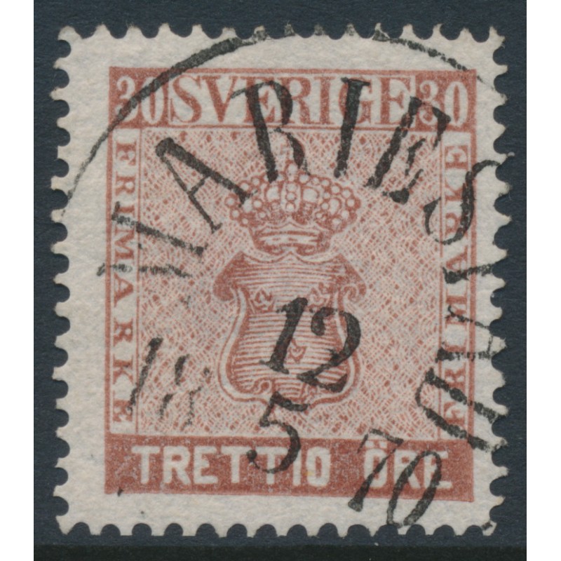 SWEDEN / SVERIGE 1858 30öre brown Coat of Arms, used – MARIESTAD 12 V 1870 cancel, has a small thin. Facit Cat. # 11e² Michel Cat. # 11a