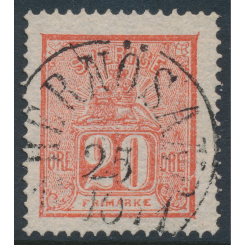 SWEDEN / SVERIGE 1866 20öre red Lying Lion, used – HERNÖSAND 25 X 1871 cancel, no thins, tears or bends. Facit Cat. # 16e Michel Cat. # 16a