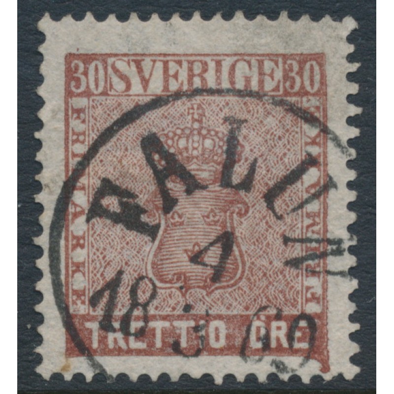SWEDEN / SVERIGE 1858 30öre brown Coat of Arms, used – FALUN 4 III 1869 cancel, no thins, tears or bends. Facit Cat. # 11e¹ Michel Cat. # 11a