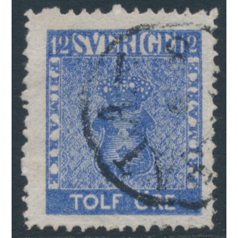 SWEDEN / SVERIGE 1858 12öre bright ultramarine Coat of Arms, used – no thins, tears or bends. Has been signed by Mats Nilsson. Facit Cat. # 9h¹