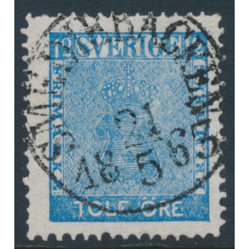 SWEDEN - 1858 12öre blue (dense background) Coat of Arms, used – Facit # 9l