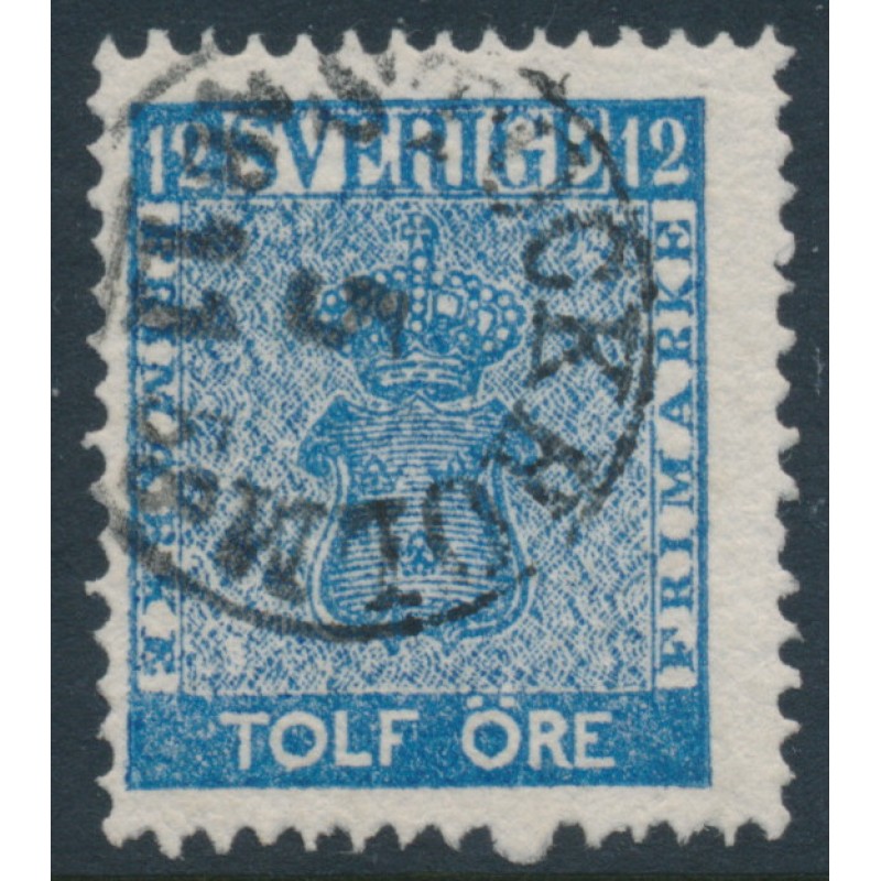 SWEDEN / SVERIGE 1858 12öre blue Coat of Arms, used – has a STOCKHOLM 5 XI 1858 cancel, no thins, tears or bends. Has been signed by Mats Nilsson. Facit Cat. # 9c¹