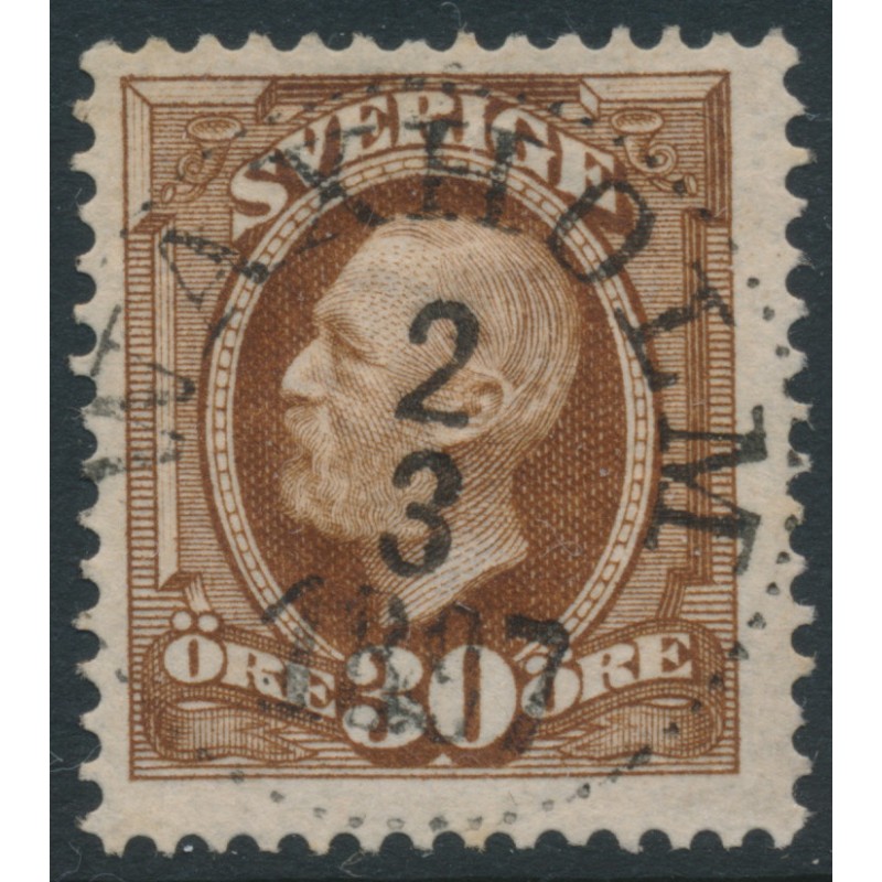 SWEDEN - 1891 30öre yellowish brown Oscar II, inverted crown watermark, used – Facit # 58avm¹