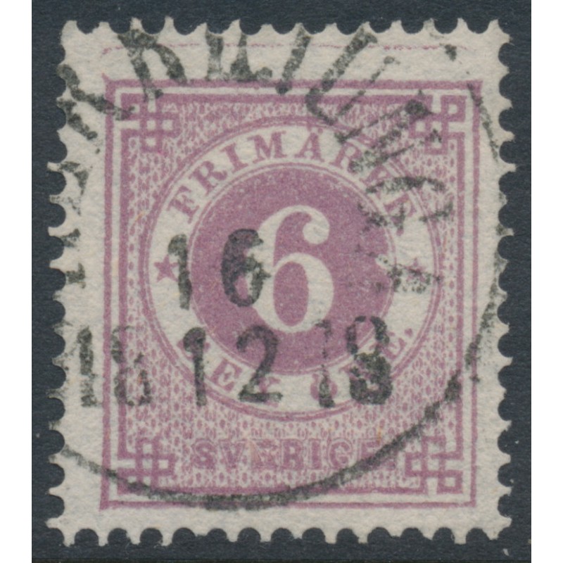 SWEDEN - 1877 6öre reddish lilac Ring Type, perf. 13, ‘line in margin’, used – Facit # 31b v9