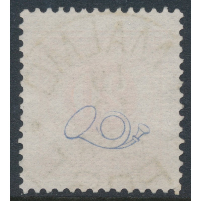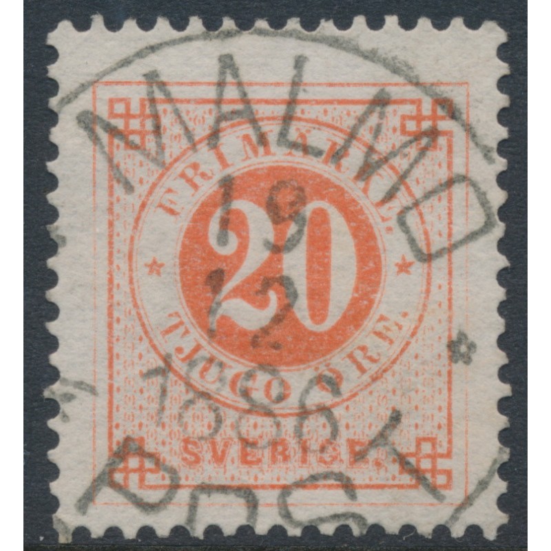 1886 20öre dull orange-red Ring Type, perf. 13 with posthorn on back, used – MALMÖ-4 POST 19 XII 1886 cancel, no thins, tears or bends.
