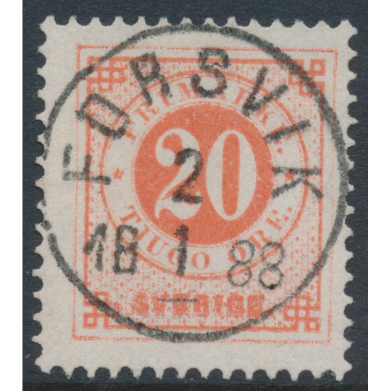 1886 20öre pale orange-red Ring Type, perf. 13 with posthorn on back, used – FORSVIK 2 I 1888 cancel (R-län), no thins, tears or bends.