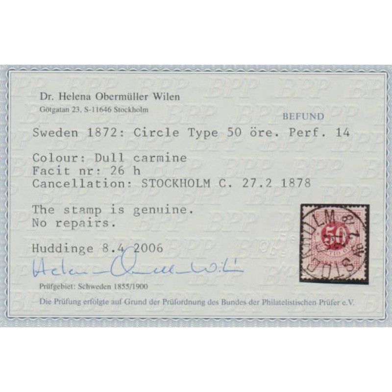 1872 50öre dull carmine Ring Type, perf. 14, used – STOCKHOLM 27 II 1878 cancel, no thins, tears or bends. Has a Helena Obermüller Wilén certificate.