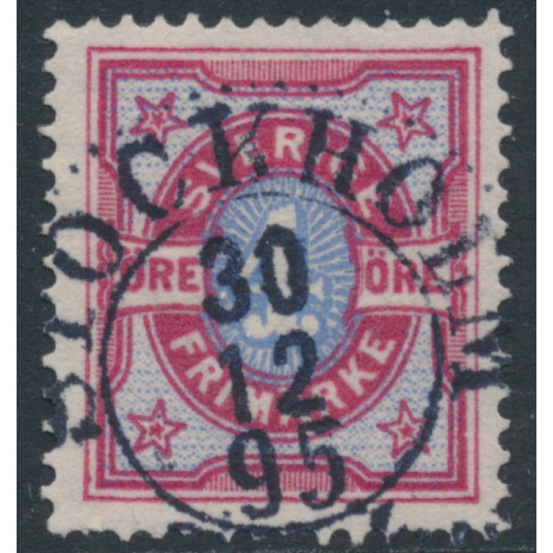 1892 4öre bright carmine/ultramarine-blue Bicoloured Numeral, used – STOCKHOLM 30 XII 1895 cancel, no thins, tears or bends.
