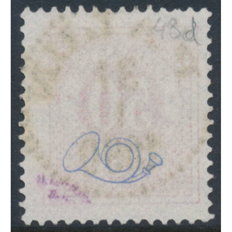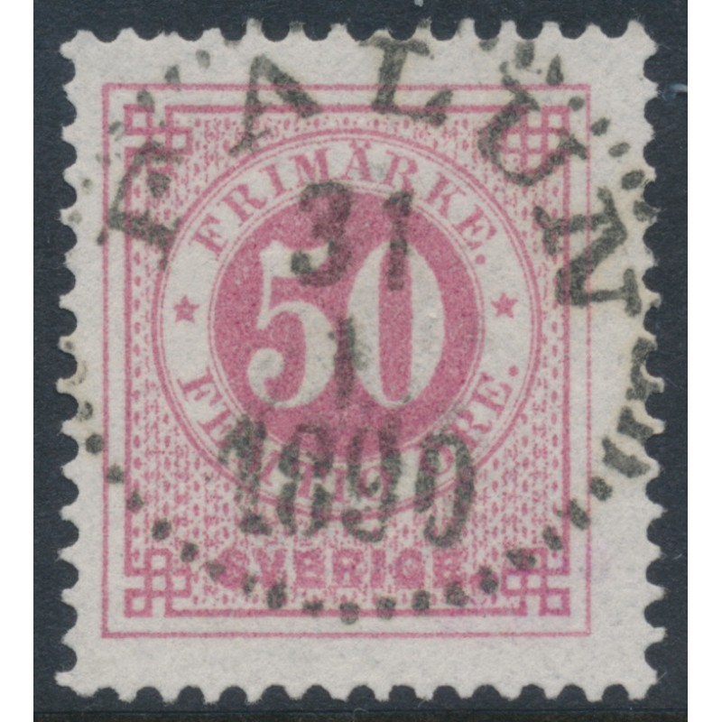 1886 50öre dull carmine Ring Type, perf. 13 with posthorn on the back, used – FALUN 31 I 1890 cancel, no thins, tears or bends.