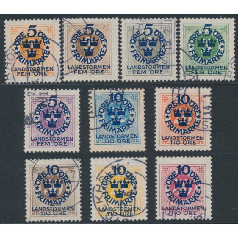 SWEDEN - 1916 2öre to 50öre Landstorm I set of 10, KPV watermark, used – Facit # 105cz-114cz