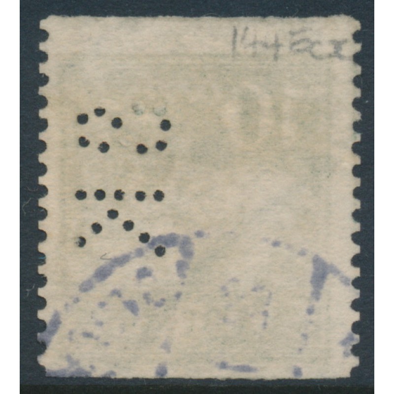 1924 10öre green Lion, perf. 13 on 2-sides, lines watermark, has an SK private perfin (skyddsperforering = det Skandinaviska Kreditaktiebolaget i Stockholm), used – no thins, tears or bends.