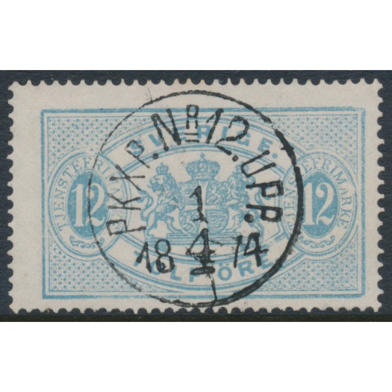 1874 12öre pale blue Large Official (Tjänstemärke), perf. 14, used – PKXP Nr 12 UPP 1 IV 1874 railway cancel, no thins, tears or bends.