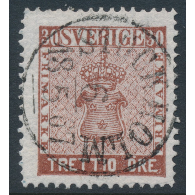 SWEDEN / SVERIGE 1858 30öre brown Coat of Arms, used – STOCKHOLM 6 V 1867 cancel, no thins, tears or bends. Facit Cat. # 11e² Michel Cat. # 11a