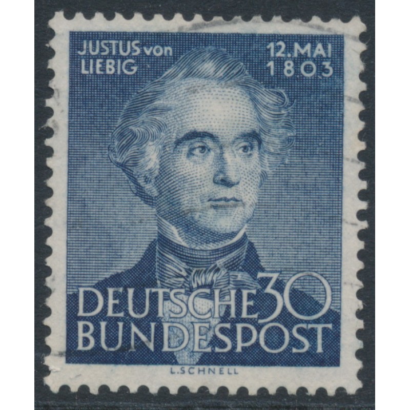 WEST GERMANY / BUNDESREPUBLIK DEUTSCHLAND 1953 30pf blue Justus von Liebig, used – no thins, tears or bends. Michel Cat. # 166
