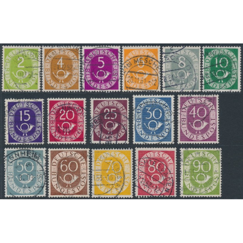 1951 2pf to 90pf Posthorns set of 16, used – no thins, tears or bends.