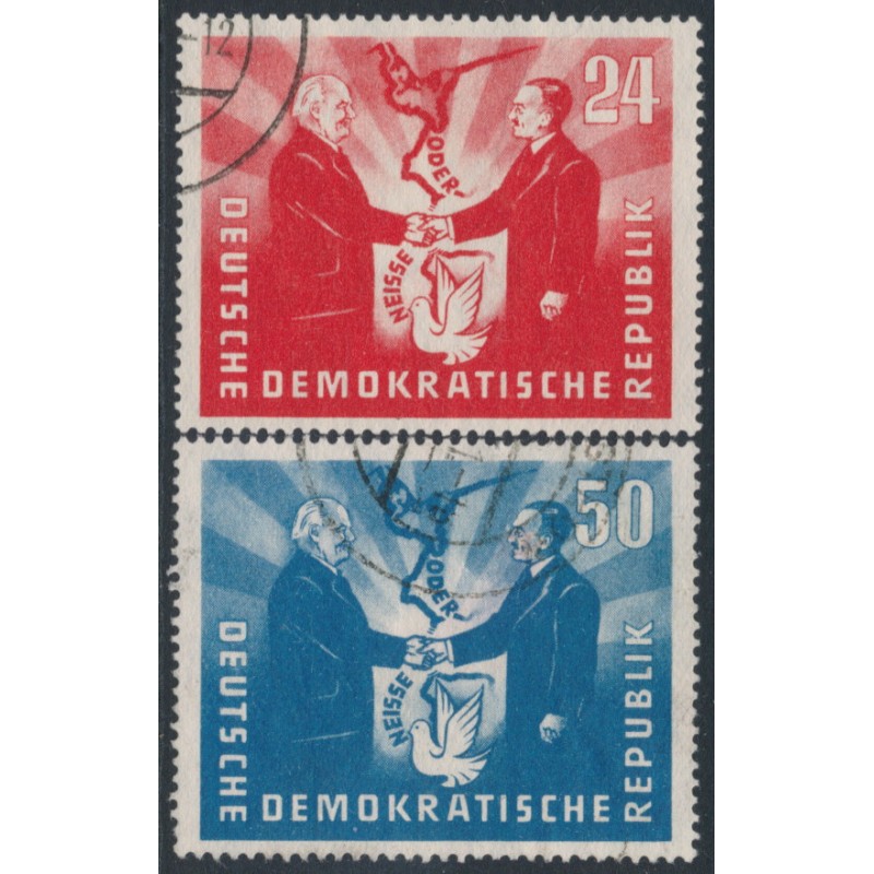 EAST GERMANY / DEUTSCHE DEMOKRATICHE REPUBLIK / D.D.R. 1951 24pf red & 50pf blue German-Polish Friendship set of 2, used – no thins, tears or bends. Michel Cat. # 284-285