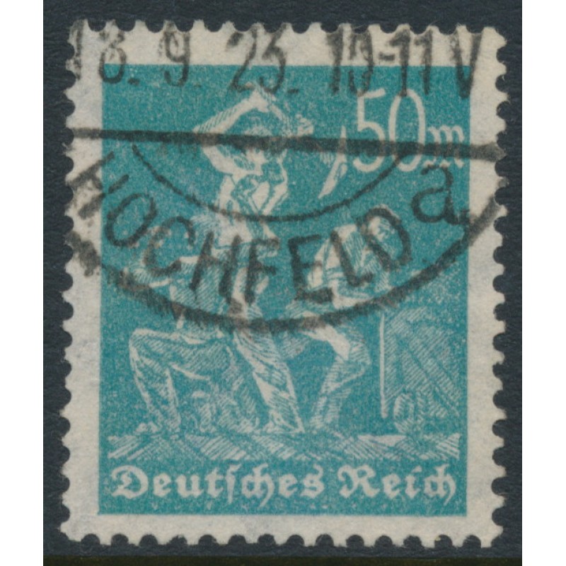 GERMANY - 1923 50Mk blue-green Miners, network watermark, used – Michel # 245