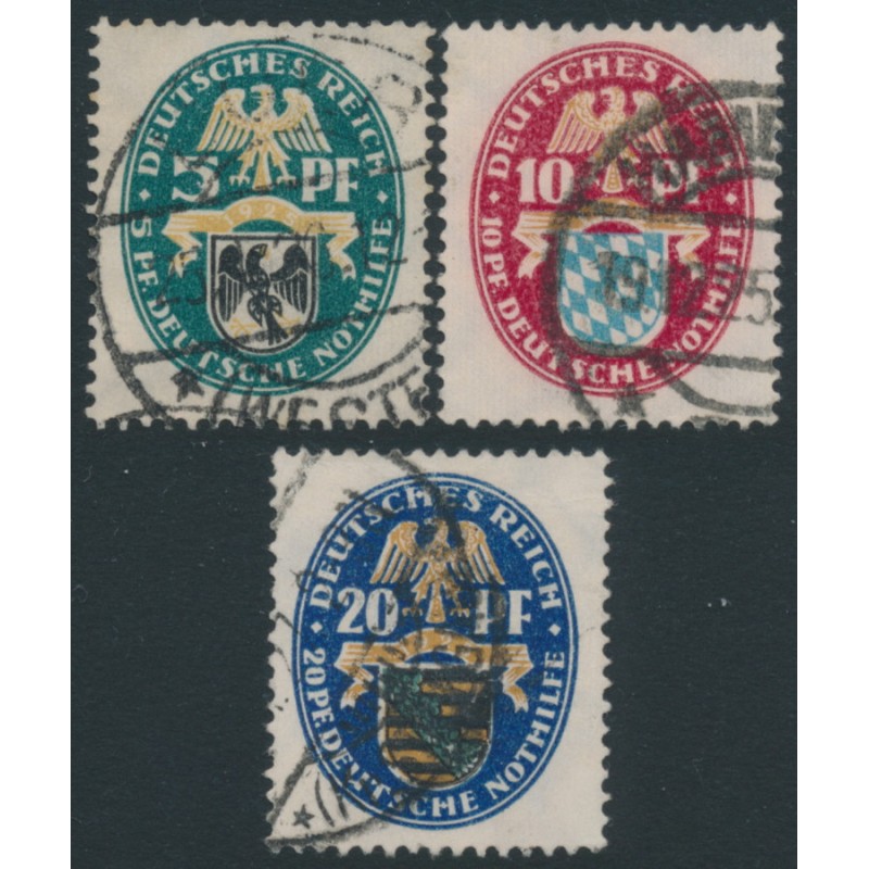 GERMANY / DEUTSCHES REICH / DEUTSCHLAND 1925 5+5Pf to 20+20pf Coats of Arms Charity set of 3, used – no thins, tears or bends. Michel Cat. # 375-377
