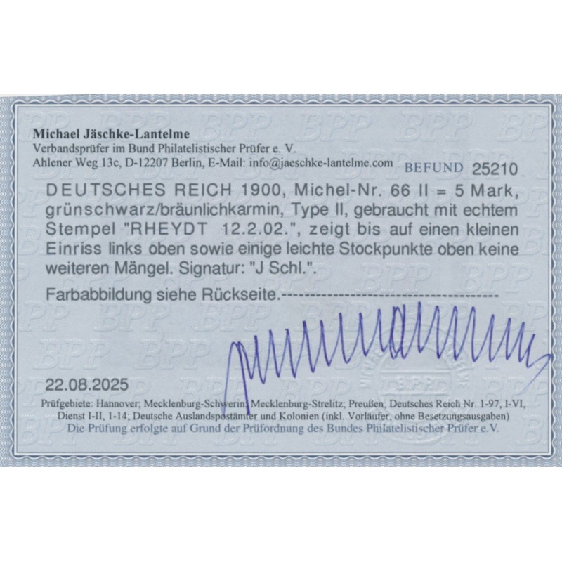 1900 5Mk deep grey/brownish carmine Commemoration of the Foundation of the Reich (Reichsgründungsgedenkfeier), inscribed REICHSPOST, type II, used – has a small tear at upper left. Has a Jäschke-Lantelme BPP photo-certificate.