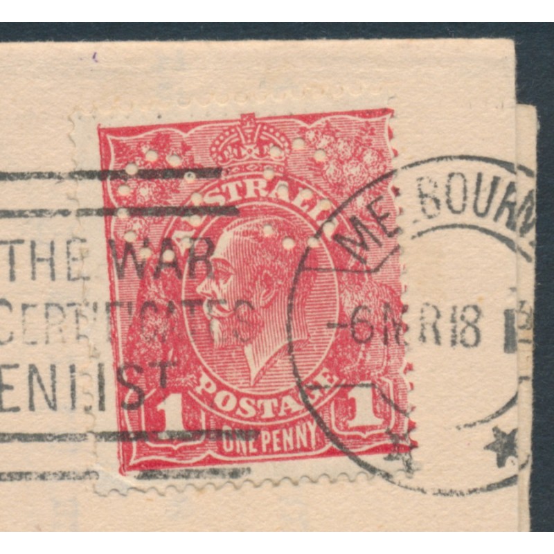 AUSTRALIA 1918 1d carmine-red KGV Head (shade = G73), perforated OS, on a folded letter, used – no thins, tears or bends. Has a Starling certificate. BW(ACSC) Cat. # 72Pbb