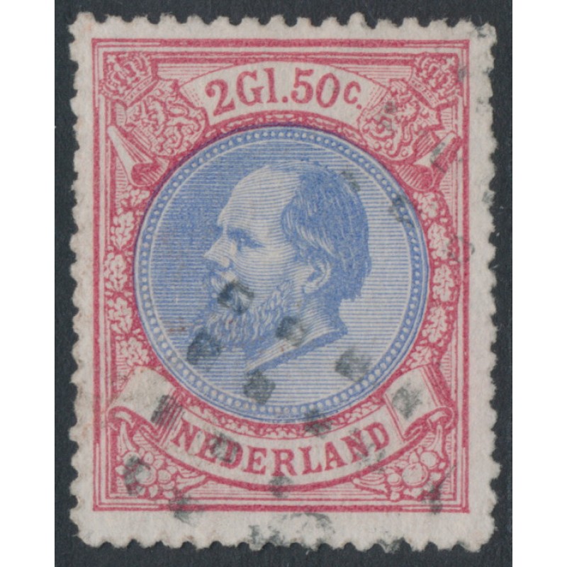 NETHERLANDS / NEDERLAND 1872 2½Gld red/blue King Willem III, perf. 14:14, used – no thins, tears or bends. NVPH Cat. # 29 Michel Cat. # 29A