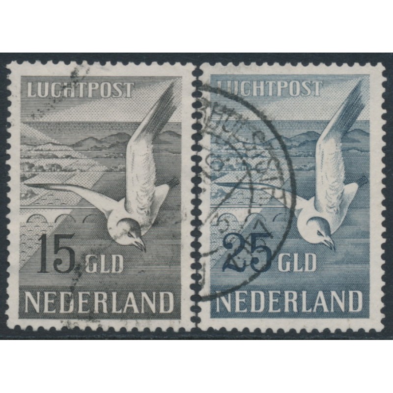 NETHERLANDS / NEDERLAND 1951 15G brown-black & 25G grey-blue Seagull airmail set of 2, used – no thins, tears or bends. NVPH Cat. # LP12 + LP13 Michel Cat. # 580-581