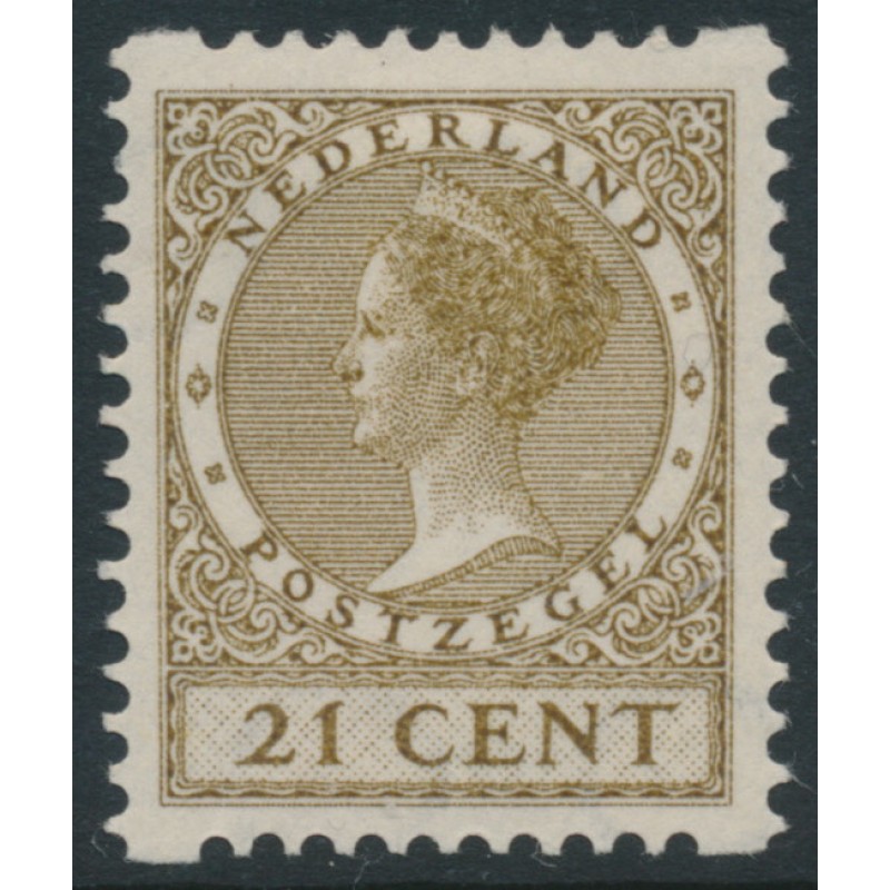 1934 21c olive-brown Queen Wilhelmina with coil perforations (syncopated perfs / roltanding), mint hinged – no thins, tears or bends.