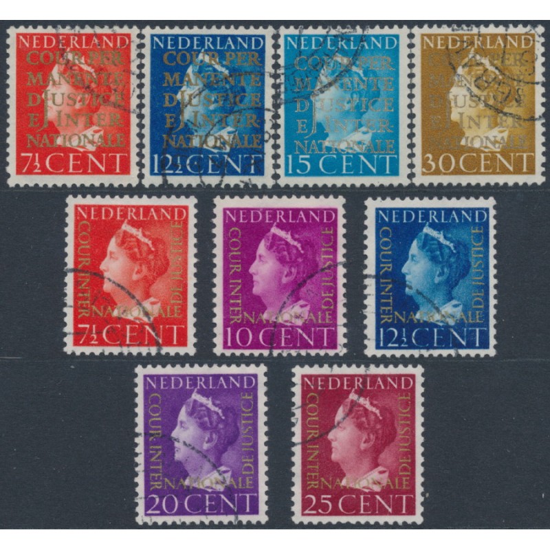 NETHERLANDS / NEDERLAND 1940-1947 7½c to 30c Queen Juliana sets with Cour Permanente de Justice Internationale overprints, used – no thins, tears or bends. NVPH Cat. # D16-D24 Michel Cat. # D16-D24