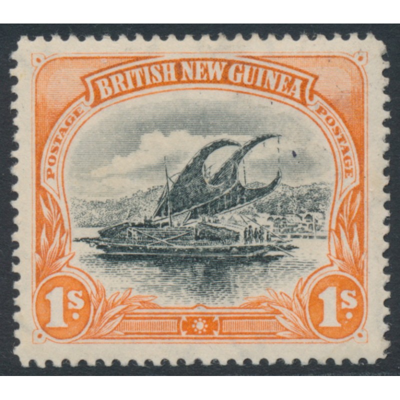 PAPUA / BRITISH NEW GUINEA / B.N.G. 1901 1/- black/orange Lakatoi, horizontal rosettes watermark, mint hinged – no thins, tears or bends. SG Cat. # 15