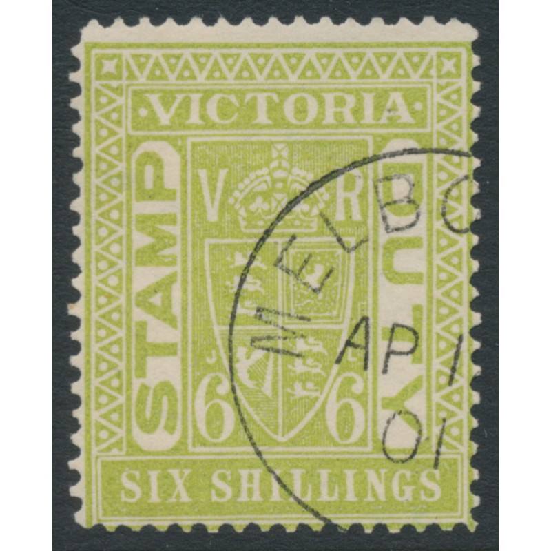 AUSTRALIA / VICTORIA 1899 6/- pale yellow-green Stamp Duty, perf. 12½:12½, V crown watermark (SG type W82), cancelled to order – without gum, no thins, tears or bends. SG Cat. # 348