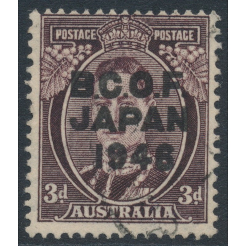 AUSTRALIA 1946 3d dark brown KGVI overprinted B.C.O.F. JAPAN 1946, used – no thins, tears or bends. BW(ACSC) Cat. # J3 SG Cat. # J3