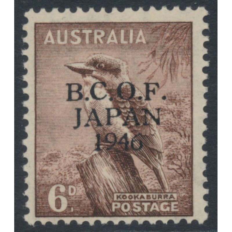 1946 6d dull brown Kookaburra overprinted B.C.O.F. JAPAN 1946, mint hinged – no thins, tears or bends.