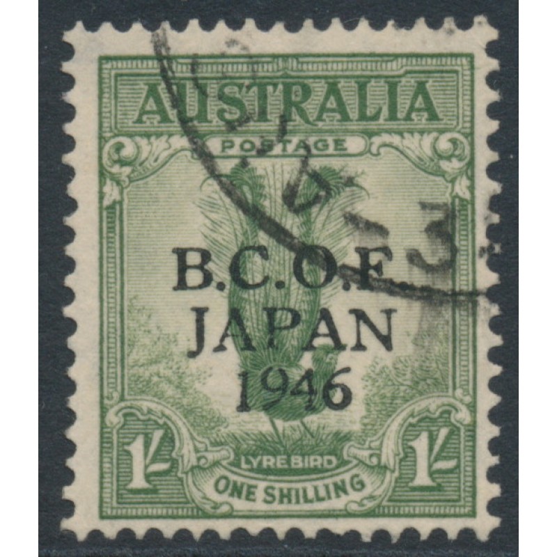 AUSTRALIA 1947 1/- dull green Lyrebird overprinted B.C.O.F. JAPAN 1946, used – no thins, tears or bends. BW(ACSC) Cat. # J5 SG Cat. # J5