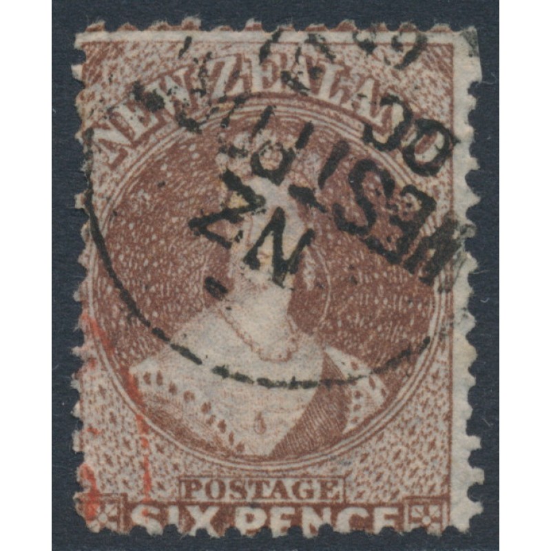 NEW ZEALAND / N.Z. / NZ 1867 6d brown Queen Victoria Chalon, perf. 12½:12½, large star watermark, used – no thins, tears or bends. SG Cat. # 122a