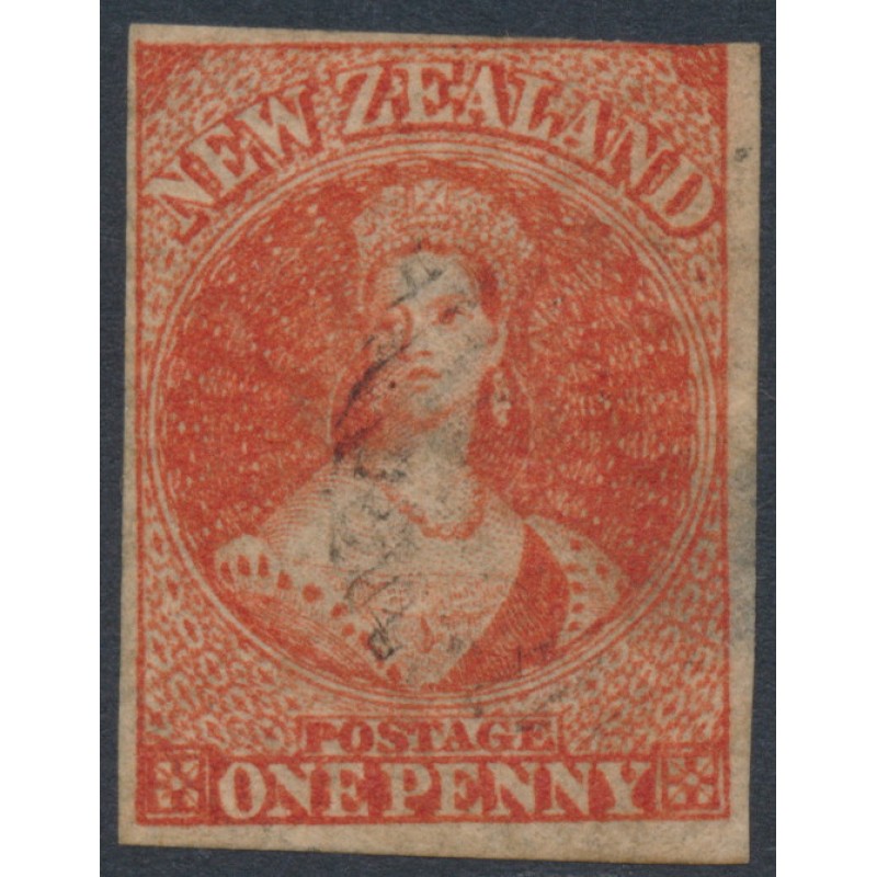 NEW ZEALAND / N.Z. / NZ 1864 1d carmine-vermilion Queen Victoria Chalon, imperforate, NZ watermark, used – has a thin. SG Cat. # 97 CP Cat. # A1j