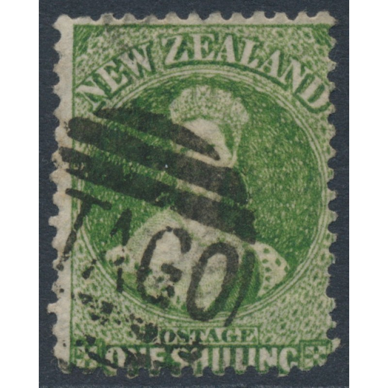 NEW ZEALAND / N.Z. / NZ 1864 1/- green Queen Victoria Chalon, perf. 12½:12½, large star watermark, used – no thins, tears or bends. SG Cat. # 124 CP Cat. # A6m(1)