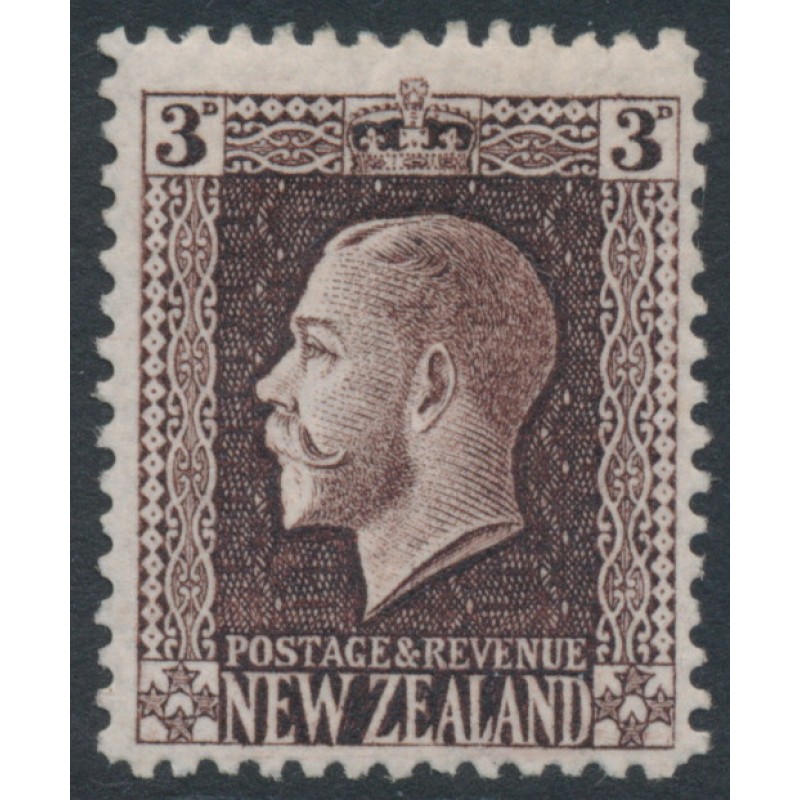 NEW ZEALAND / N.Z. / NZ 1929 3d chocolate King George V, line perf. 14:14, on Cowan paper, mint hinged – no thins, tears or bends. SG Cat. # 449b