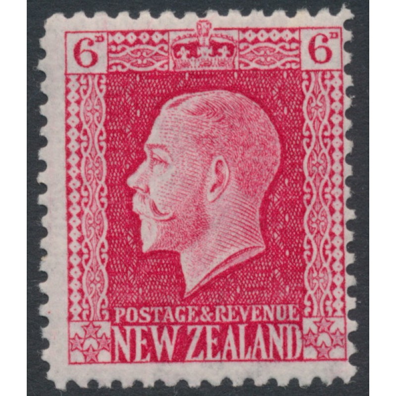 NEW ZEALAND / N.Z. / NZ 1916 6d carmine King George V, line perf. 14:14, sideways wide spaced NZ star watermark, mint never hinged – no thins, tears or bends. SG Cat. # 434