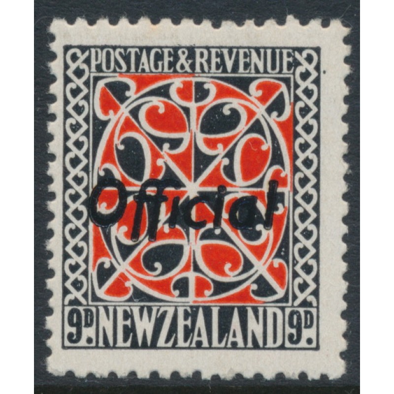 NEW ZEALAND / N.Z. / NZ 1943 9d scarlet/black Maori Design, perf. 14:15, overprinted OFFICIAL, mint hinged – no thins, tears or bends. SG Cat. # O130