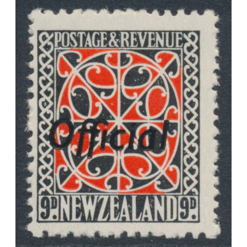 NEW ZEALAND / N.Z. / NZ 1943 9d scarlet/black Māori Design, perf. 14:15, overprinted OFFICIAL, mint hinged – no thins, tears or bends. SG Cat. # O130