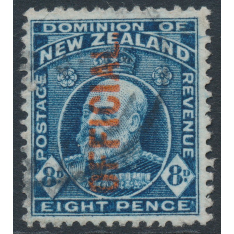 NEW ZEALAND / N.Z. / NZ 1916 8d indigo-blue King Edward VII, perf. 14:13½, overprinted OFFICIAL, used – no thins, tears or bends. SG Cat. # O76b