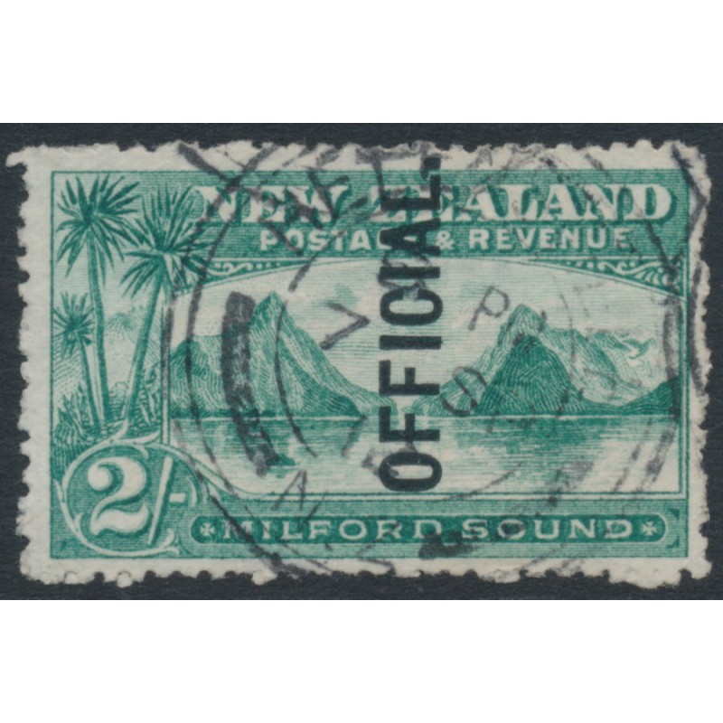 NEW ZEALAND / N.Z. / NZ 1907 2/- blue-green Milford Sound, overprinted OFFICIAL, used – no thins, tears or bends. SG Cat. # O66