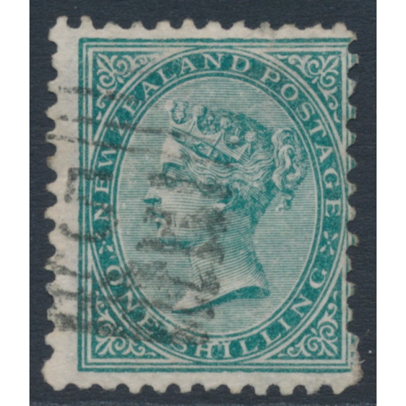 1878 1/- green Queen Victoria, perf. 12:11½, NZ star watermark (6mm spacing = SG type 12a), used – no thins, tears or bends.