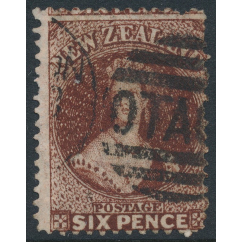 NEW ZEALAND / N.Z. / NZ 1864 6d red-brown Queen Victoria Chalon, perf. 12½:12½, ‘NZ’ watermark, used – no thins, tears or bends. SG Cat. # 108 CP Cat. # A5f(X)